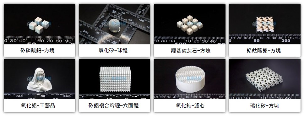 支援材料 | 氧化鋯、氧化鋁、碳化矽、氧化矽、鈦酸鋇、羥基磷灰石等可紫外固化的所有光敏陶瓷材料, 各類光敏樹脂材料 |